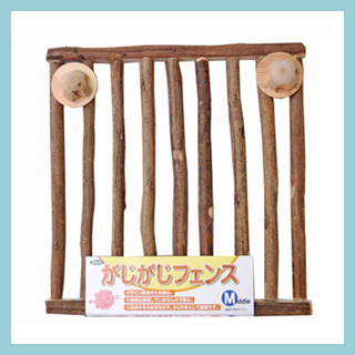 ティモの大好きなかじり木の『KAWAI がじがじフェンス』。MサイズよりSサイズの方を使う機会が多いですが、へやんぽコーナーではMサイズを愛用しています。木の皮を上手に齧って剥がしては、むしゃむしゃするのが好きです。